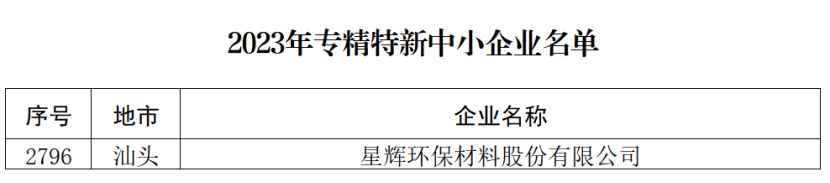 近日,廣東省工業(yè)和信息化廳公布了“2023年廣東省專精特新中小企業(yè)名單”(通告[2024]1號(hào)),星輝環(huán)材(以下簡(jiǎn)稱“公司”)成功通過廣東省“專精特新”企業(yè)認(rèn)定。